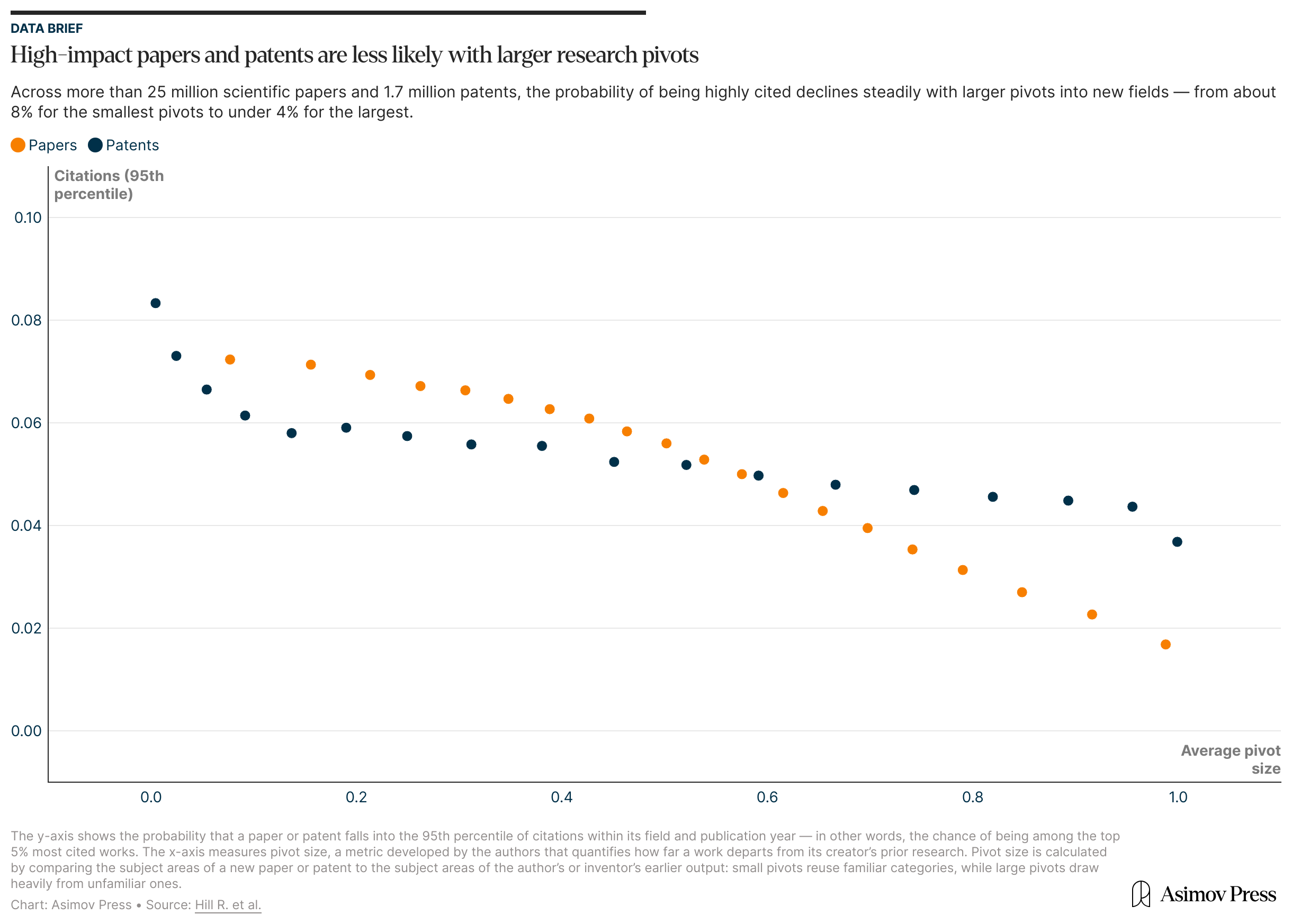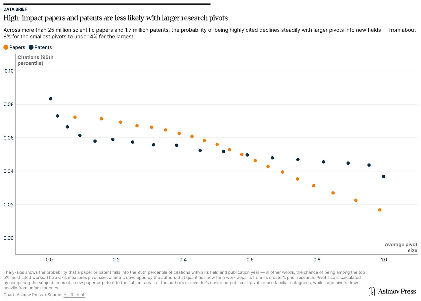 After all, scientists are often disincentivized from big pivots in their research program. Making important discoveries in science requires studying longer, working harder, and raising more grant money than it did in the past, and deviating from an already-established research track can jeopardize publication rates, tenure applications, and credibility. A paper published earlier this year reported that moving to a new research area lessens the impact of a scientist’s work, a phenomenon the authors said “applies nearly universally across science,” regardless of a scientist’s career stage, productivity, or funding situation.