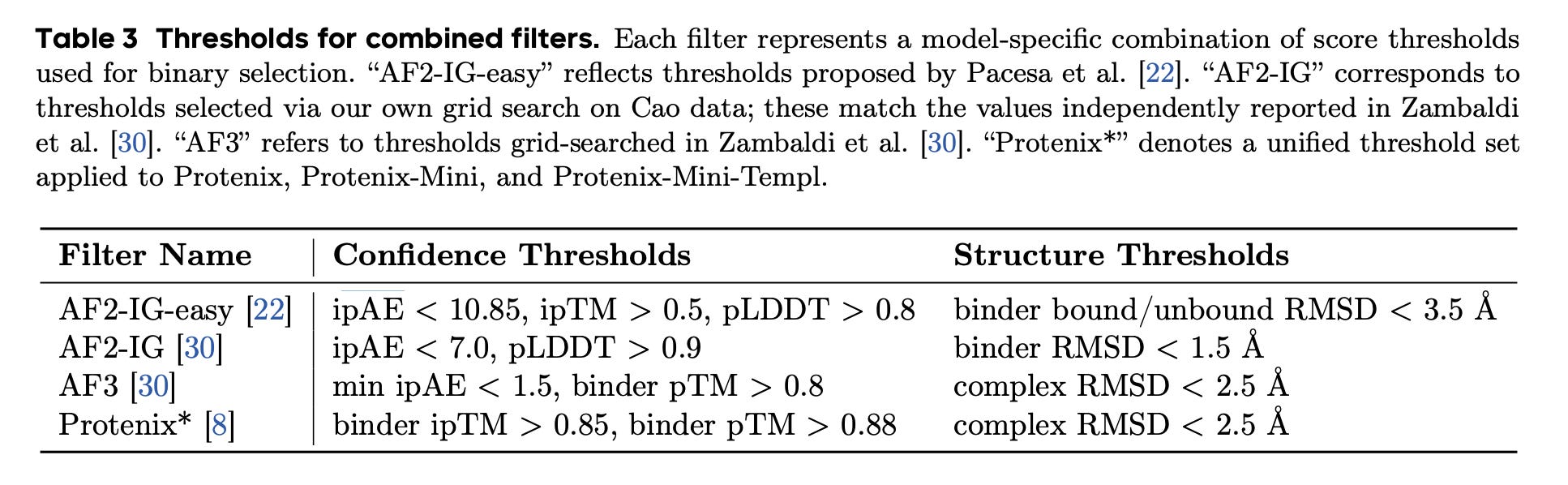 Scoring and ranking designs is one of the most involved — and most confusing — parts of binder design. BoltzGen outputs many metrics, including ipTM, predicted hydrogen bonds, and surface accessibility, combining them into a single “Quality Score” using a heuristic formula. The team behind PXDesign did a comprehensive review of scoring across BindCraft and other tools, and landed on thresholds of ipTM > 0.85, pTM > 0.8, and complex RMSD < 2.5Å as a reasonable way to separate binders from non-binders. These thresholds work fairly well, though as far as anyone can tell, no single metric or combination of metrics reliably predicts affinity.