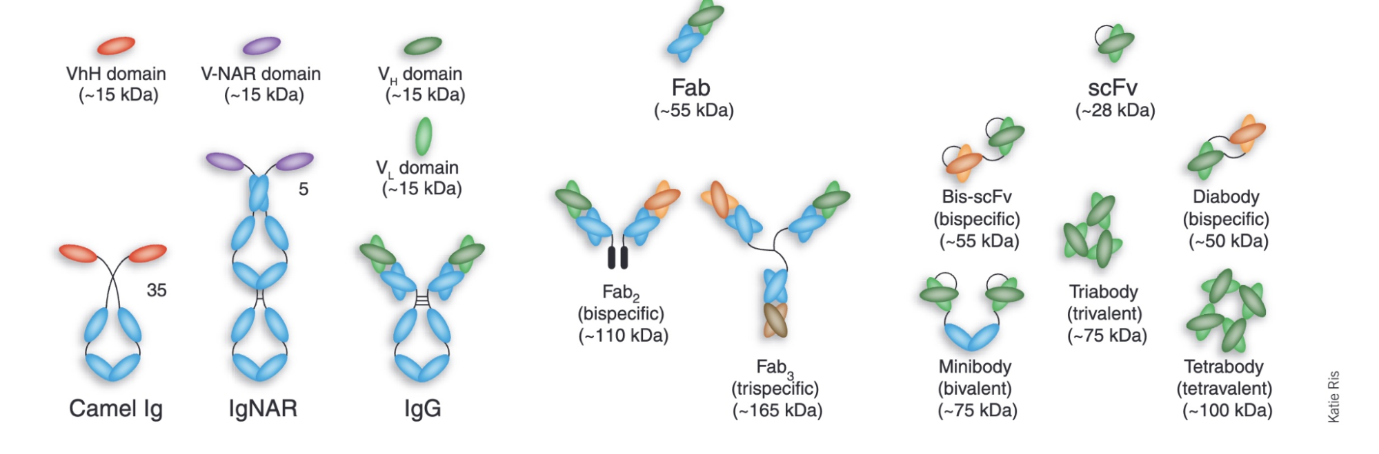 Antibodies are not the only type of protein binder, and binders are generally catalogued according to their size. A “peptide” is any protein smaller than 30 amino acids, a “mini-binder” is between 50 and 250 amino acids in size, and an “antibody” covers anything from a 120-amino-acid antibody fragment to a multi-chain, 1,300 amino acid molecule.