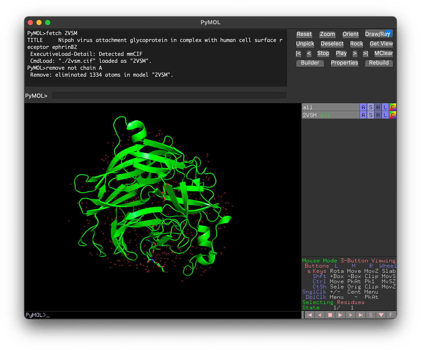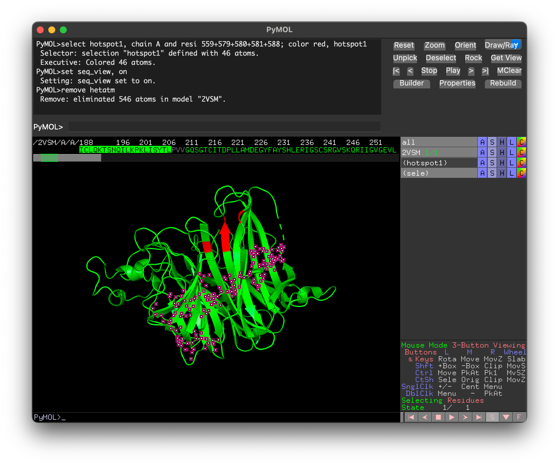 remove not chain A. To also show the protein sequence, typeset seq_view, on. The red dots on the screen are mostly water atoms, which can be removed with the commandremove hetatm.