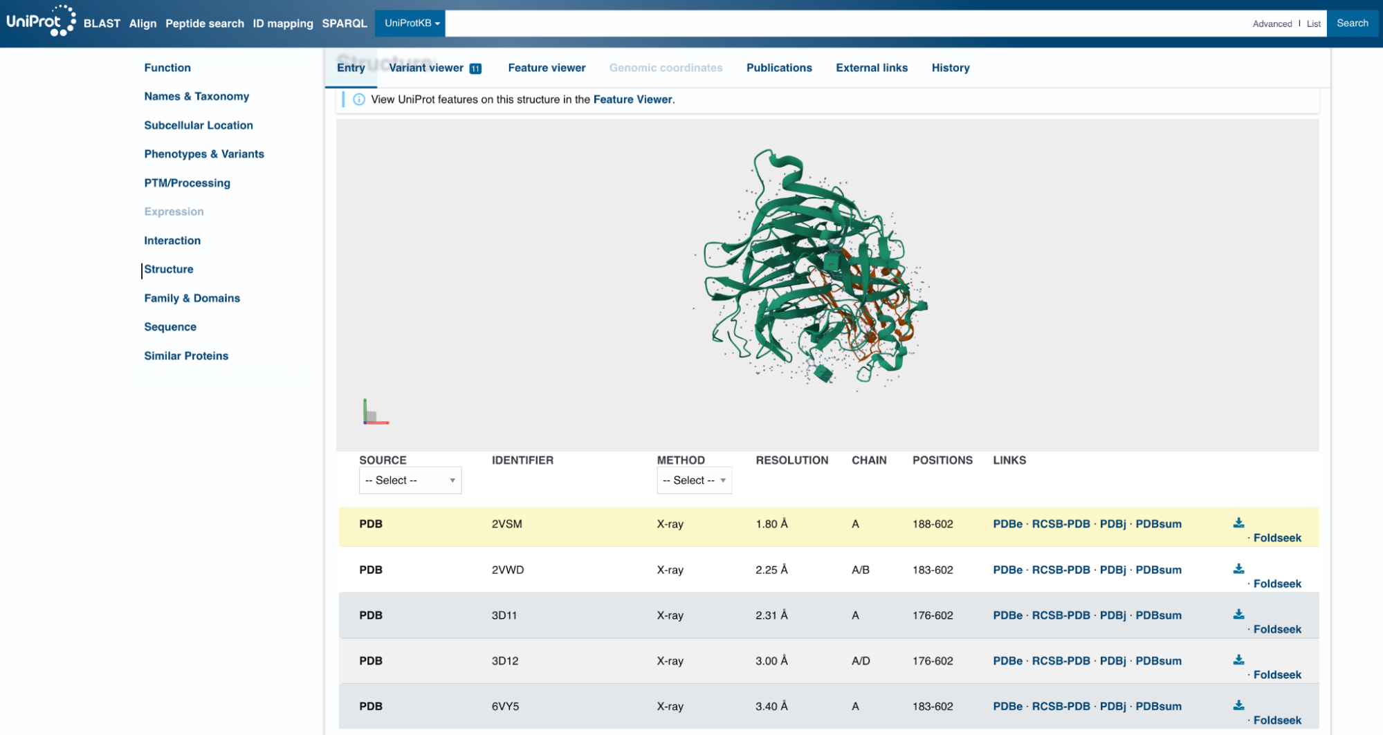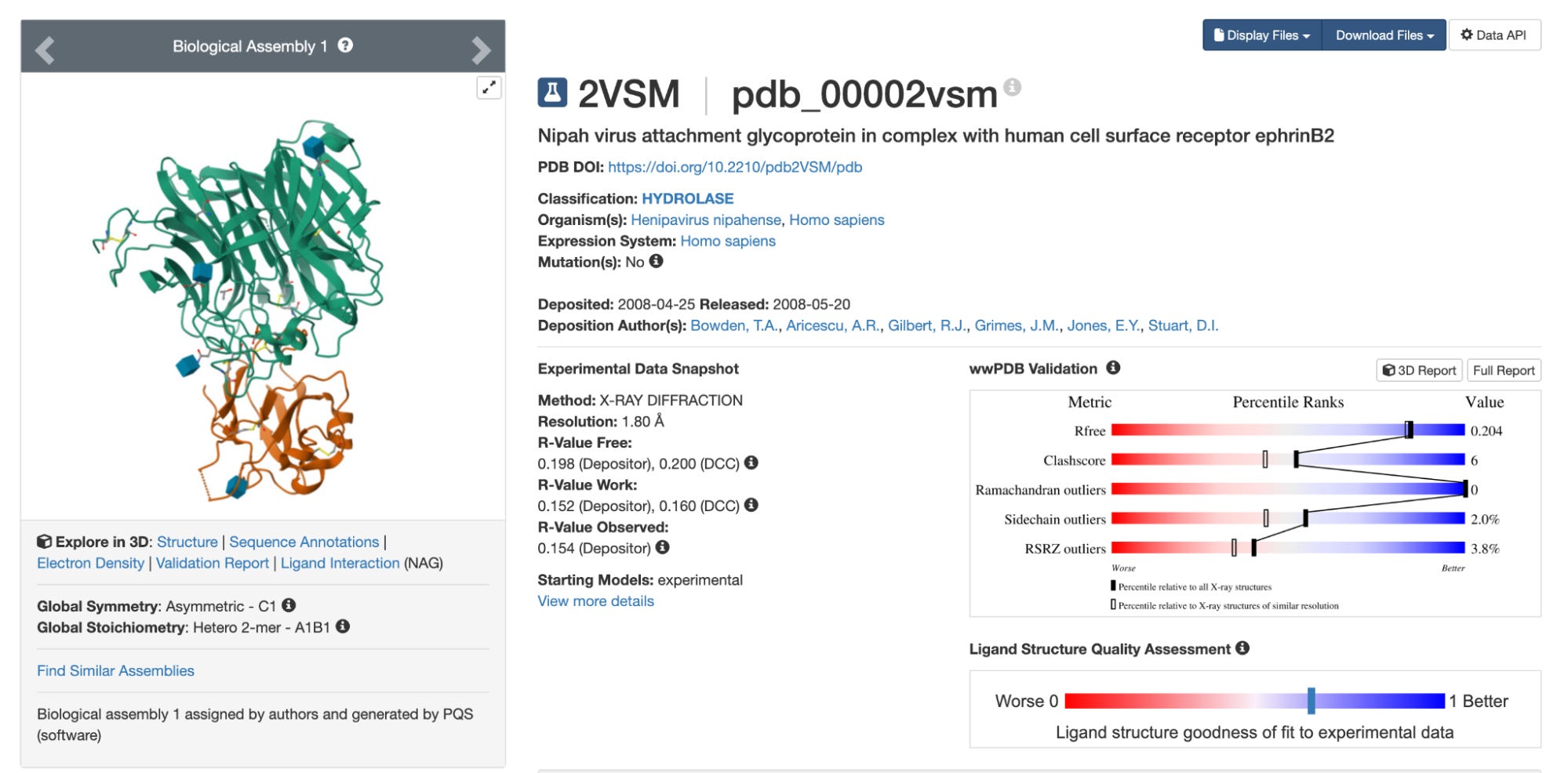 Looking at the UniProt list, 2VSM seems like a reasonable choice of target. It has the highest resolution of the available options, at 1.8 Å, slightly longer than a carbon-carbon bond. (Anything below 2 Å is considered high resolution for X-ray crystal structures.) The 2VSM structure also includes the virus’s natural receptor, Ephrin-B2, which shows exactly where on the surface a binder might attach.