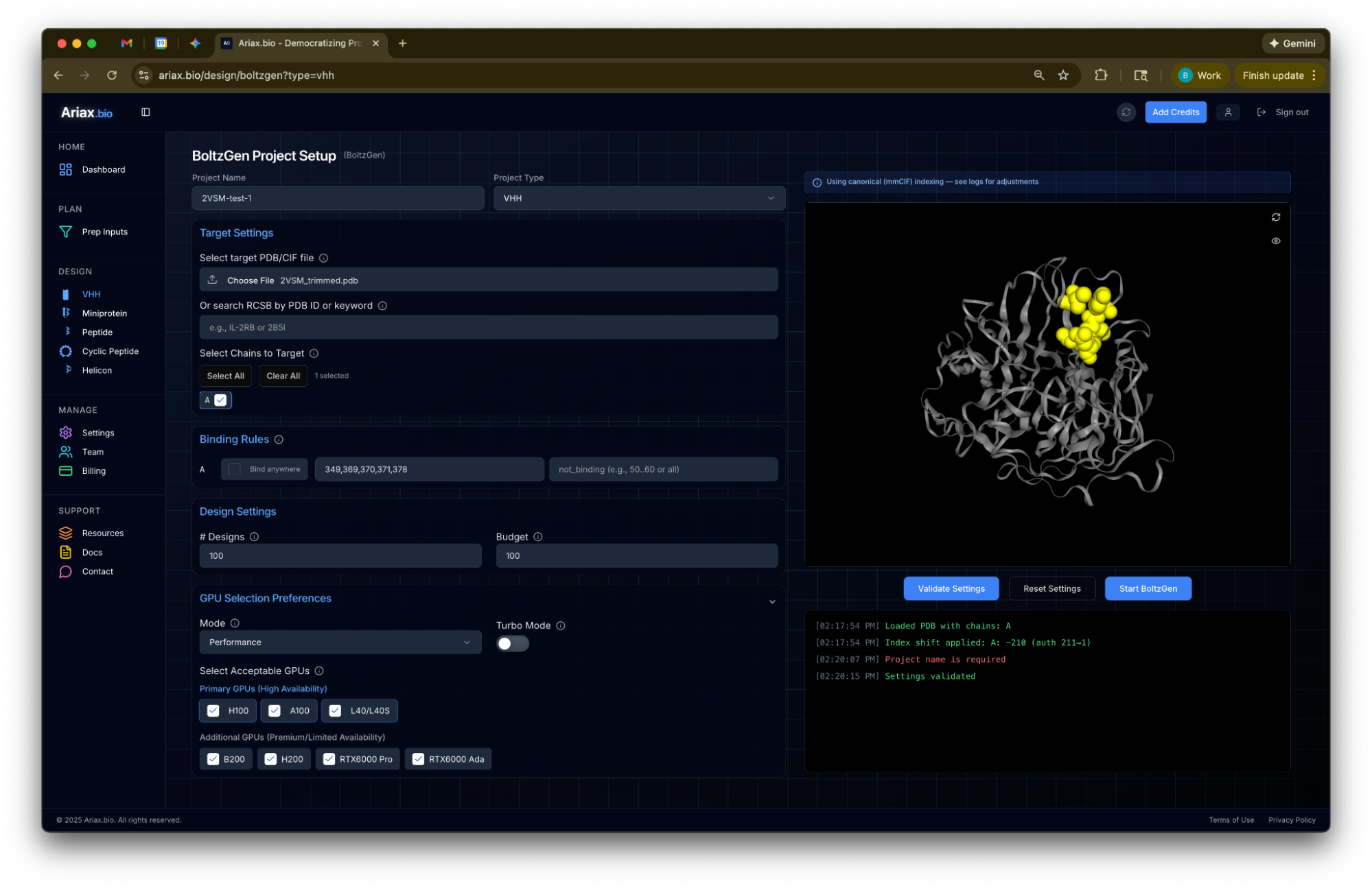 Finally, click Validate Settings to check for errors, then click Start BoltzGen.