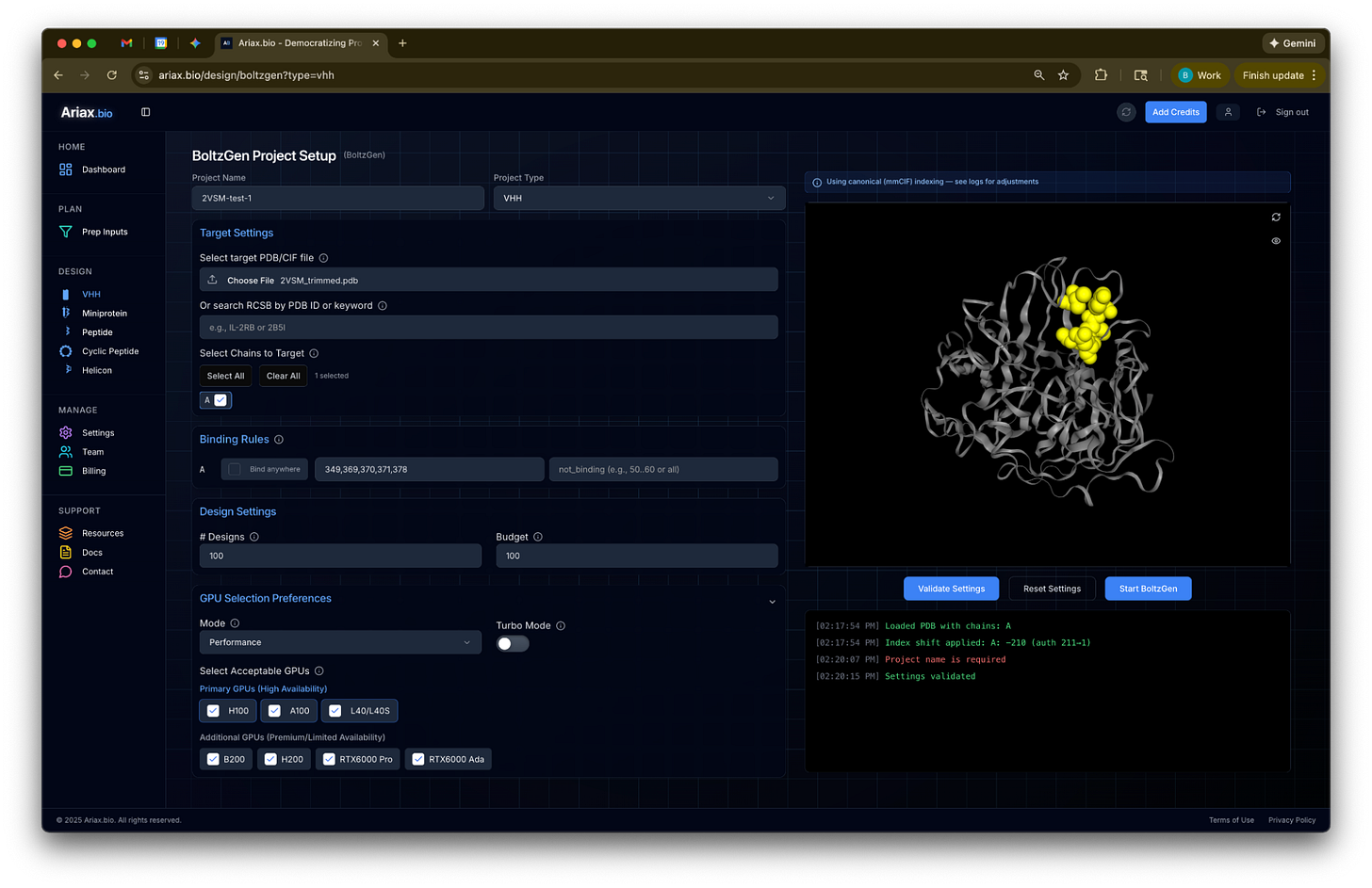 Setting up a run on Ariax takes only a few minutes. The Ariax team have written a helpful tutorial with additional tips, and the defaults are sensible enough for both beginners and experienced users, though not every BoltzGen parameter is exposed. If you wanted to use a custom VHH framework, for example, you would need to generate the appropriate configuration files and run BoltzGen yourself. The BoltzGen documentation covers this, though getting GPU-dependent tools like BoltzGen running locally can be genuinely challenging.