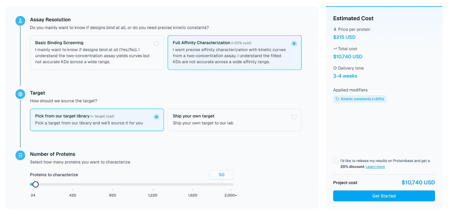 Each design costs $119-215 to test, depending on how many you submit. Assuming a full campaign of 50,000 designs and testing the top 50, the total comes to roughly $4,000 for compute and $12,000 for testing — plus a few hundred dollars for Adaptyv to acquire the target protein. Careful filtering before submission can reduce these figures.