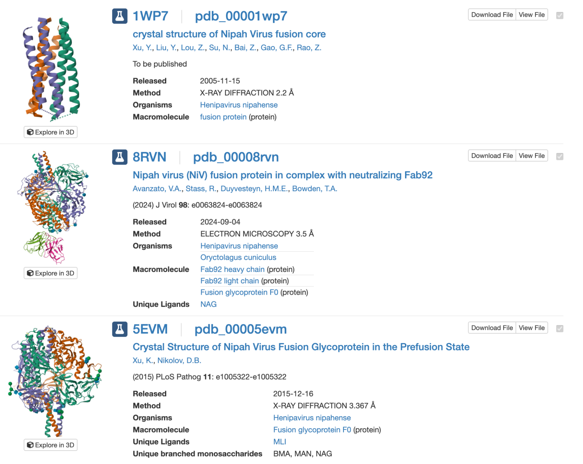 The PDB is the main repository for protein structures, but its search engine is imprecise. Querying “Nipah virus Glycoprotein G” returns 32 results, many unrelated to Nipah, and the interface is hard to navigate unless you are a crystallographer.