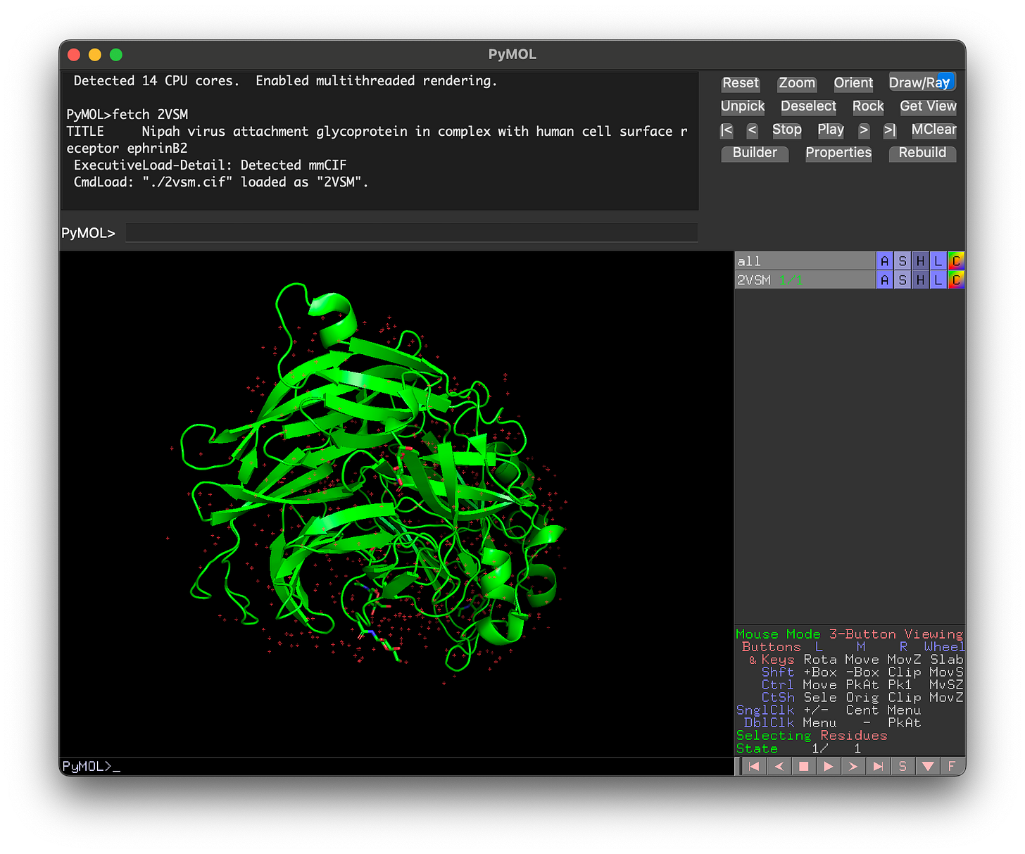 First, load the 2VSM.cif file into PyMOL by typing