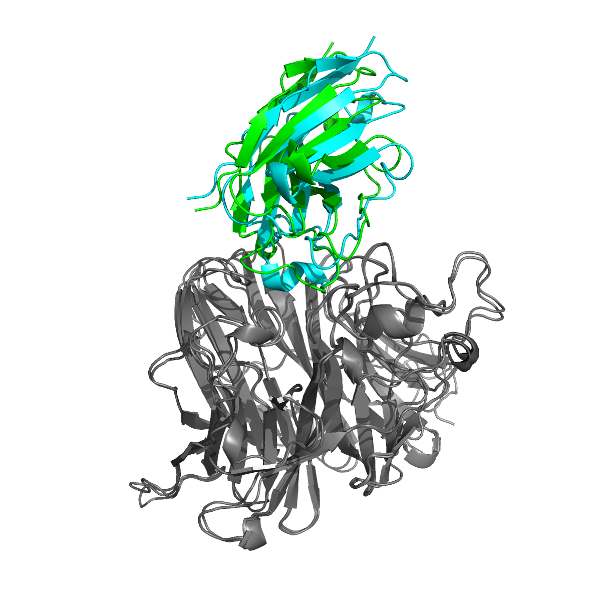 In PyMOL, load both .cif files, align them, and compare the BoltzGen pose to the AlphaFold 3 pose against the Nipah G structure. Since Nipah G is in the PDB, both structures should align closely. In this case, BoltzGen gives the design an ipTM of 0.78, while AlphaFold 3 gives its slightly different pose an ipTM of 0.73.