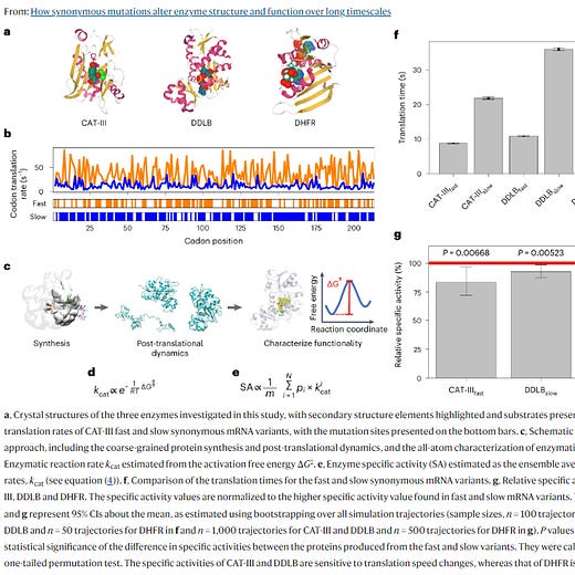 A fast-translated version of one enzyme had a 20 percent decrease in activity compared to its normal version. For another enzyme, the slow-translated version had about a 9 percent drop in activity. Just remember that these are the exact same protein sequences; they’re just encoded by different codons.