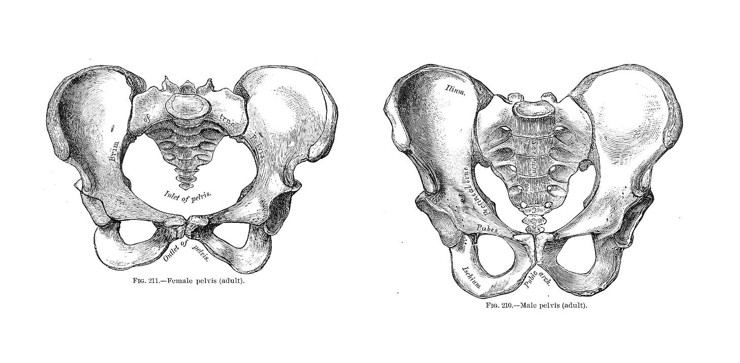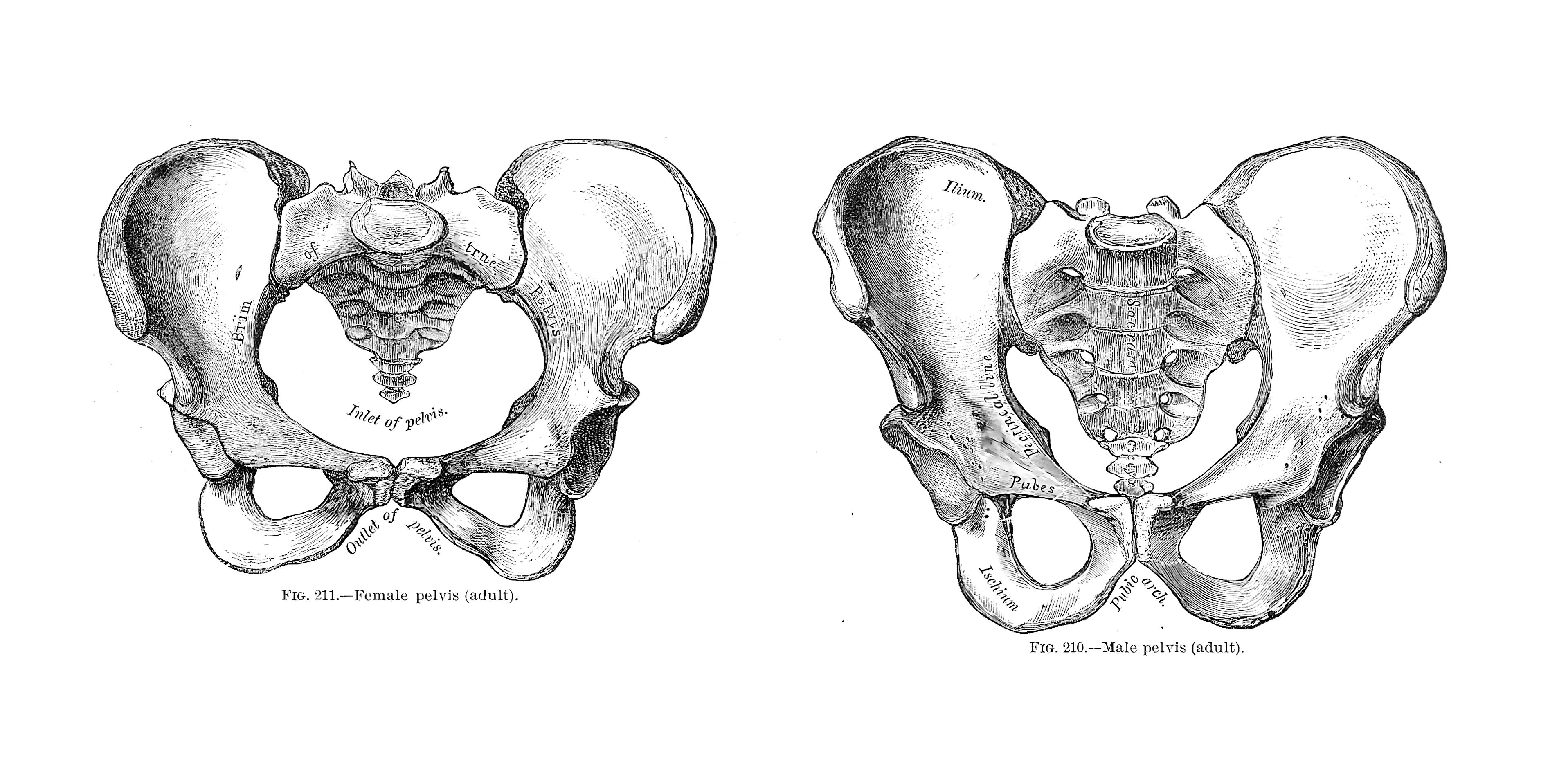 First, then, they needed to determine whether this skeleton belonged to a young man. Estimating a skeleton’s sex relies on multiple features that show statistical tendencies rather than absolutes; even so, the pelvis can be a strong indicator. In females, to aid in childbirth, the pelvic inlet, the circular opening in the upper area of the pelvis, is wider. And the pubic angle, the upside-down V-shape or arch at the very bottom of the pelvis, is broader. In contrast, males have narrower, more angular pelvises.