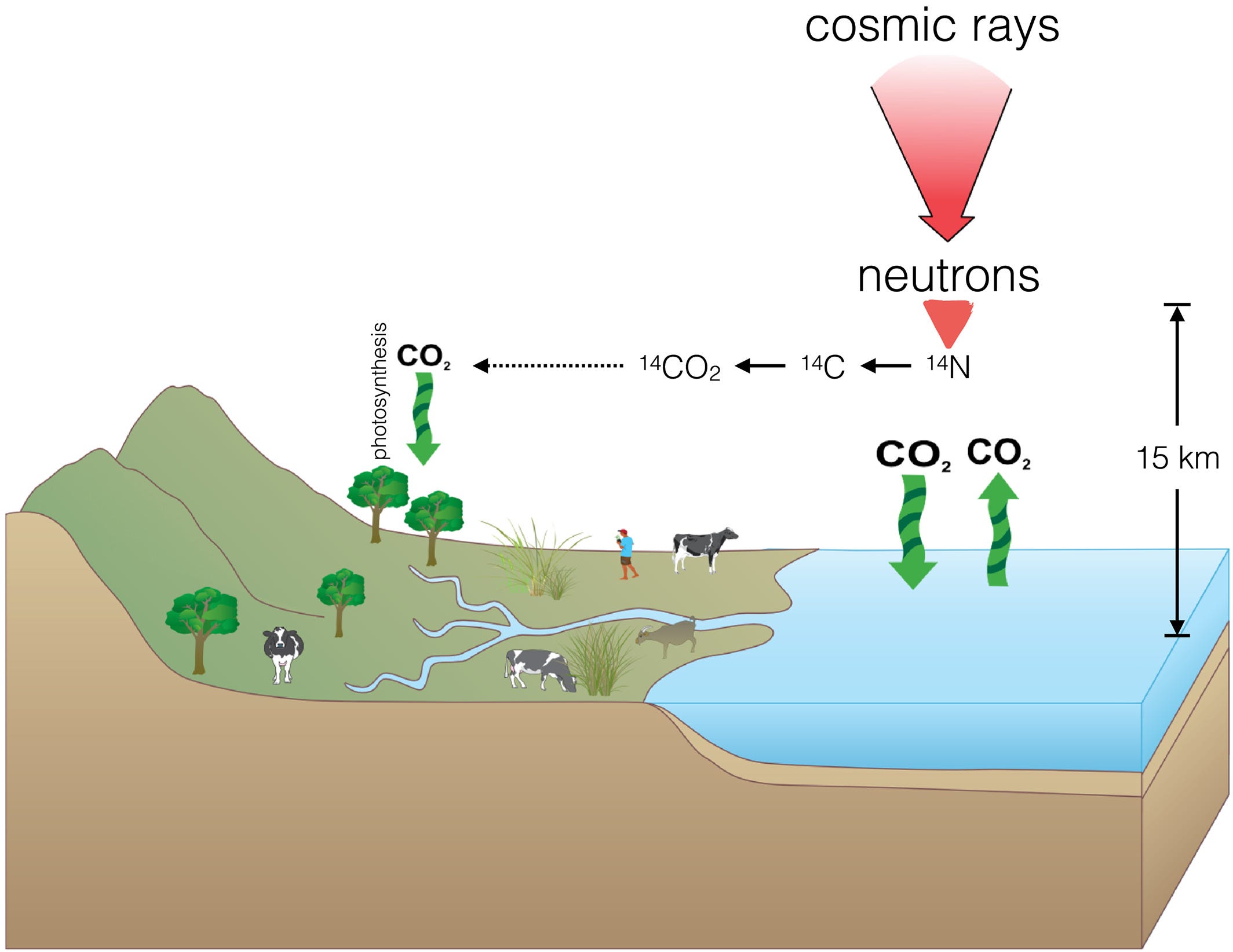 Carbon exists in several forms. Most is carbon-12, which is stable. But a tiny fraction, about one atom in a trillion, is carbon-14, which is radioactive. It’s constantly created in the upper atmosphere when cosmic rays strike nitrogen atoms, and it filters down into all living things on our planet. Plants absorb it during photosynthesis, and when animals eat these plants, carbon is taken up by their tissues.