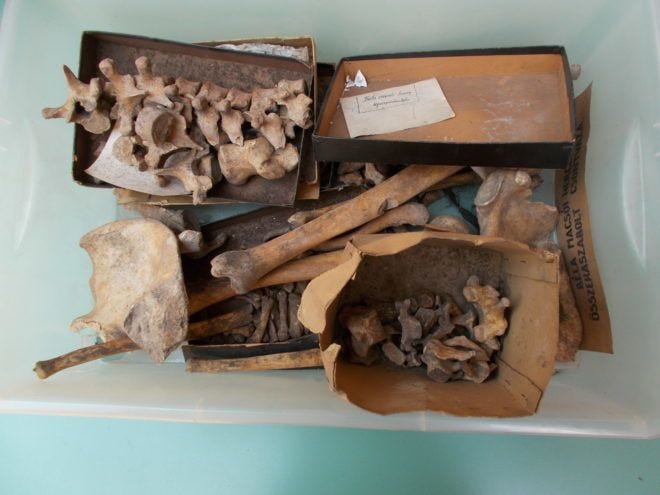 In 2018, interest resumed when researchers at the Hungarian Natural History Museum found postcranial bones that had been missing from the skeleton for eighty years, tucked away in the box with Bartucz’s handwritten note. Zsolt Bernert and Ágota Buzár published preliminary findings on the several long bones, fragments of the pelvis, and vertebrae scored with cut marks.