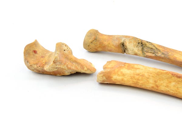 Every excavated skeleton shows wear: fractures from soil pressure, breaks from careless excavation, and erosion from groundwater. Bones absorb minerals from surrounding earth, staining brown or yellow depending on soil chemistry. This discoloration helps identify when damage occurred. Ancient healed injuries show bone remodeling around the wound. Fresh breaks from modern handling expose pale, unstained bone. The harder question is whether an unhealed, stained wound represents a killing blow or damage inflicted during burial centuries ago.