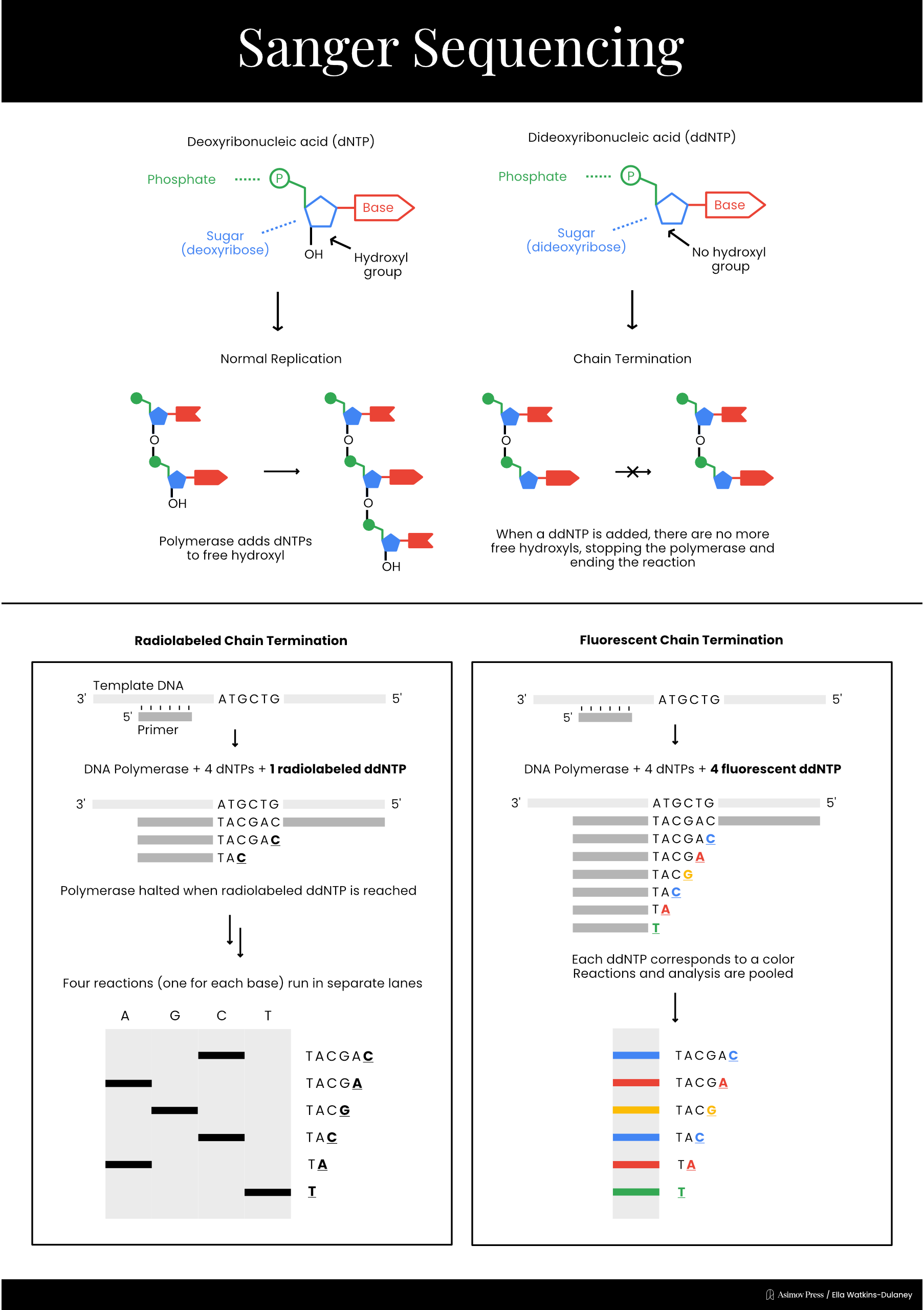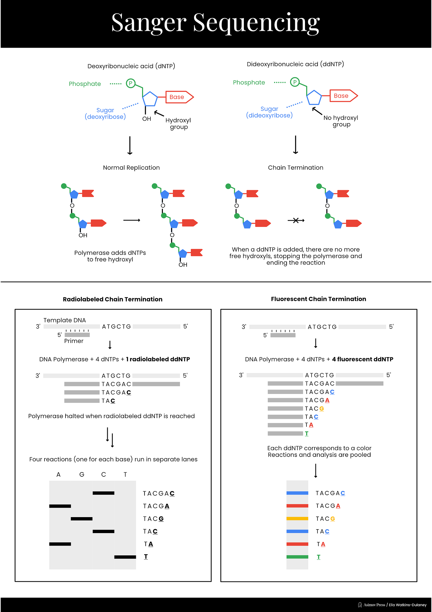 In 1977, Sanger developed a much simpler sequencing method, called “chain termination,” which is today known simply as Sanger sequencing. This technique took advantage of a different type of special nucleotide called a dideoxyribonucleotide, or ddNTP. ddNTPs lack one of the hydroxyl groups present on a normal dNTP, preventing the chemical reaction necessary to add another nucleotide and terminating DNA elongation.