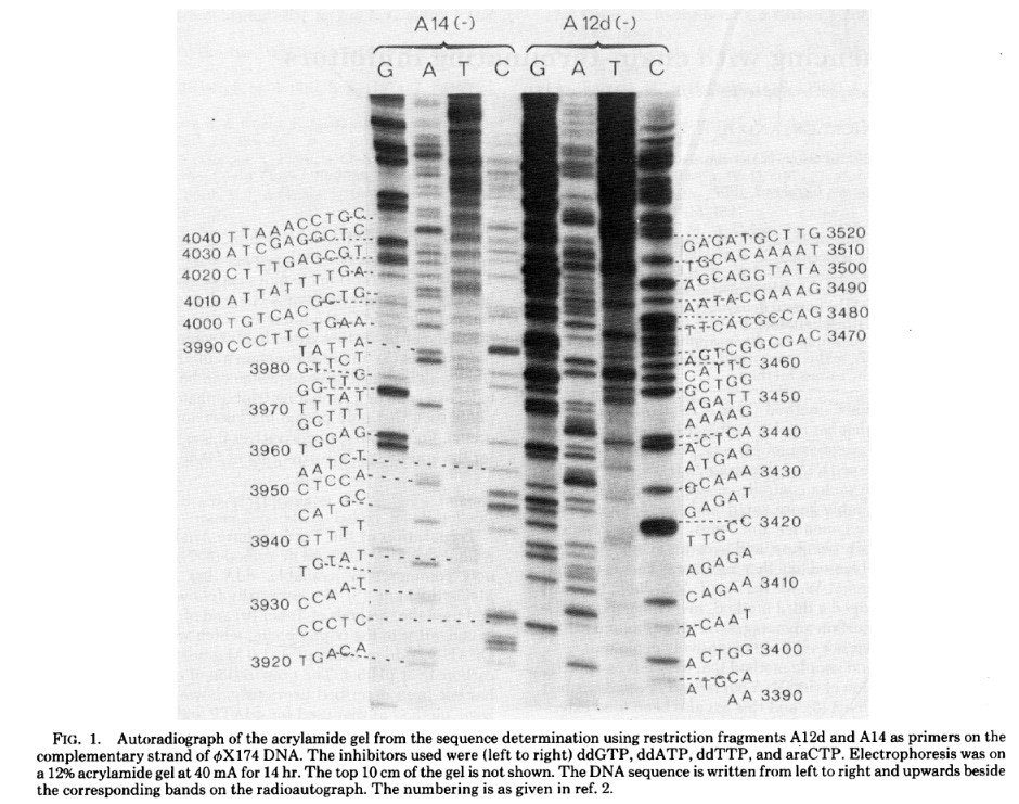 Since the eight reactions were run on fragments of random length, the eight plus and minus reactions collectively produced DNA fragments of all possible lengths.4 The fragments in these eight reactions were separated by size (using gel electrophoresis) and then imaged with autoradiography. Gels were dried and then placed against X-ray film, allowing the radioactive DNA fragments to expose the film and appear as dark bands, which a scientist could then painstakingly translate into the DNA sequence. In 1977, Sanger and colleagues sequenced the first full DNA genome using this method: a small bacterial virus with 5,386 nucleotides in its genome, called ɸX174 or “PhiX.”