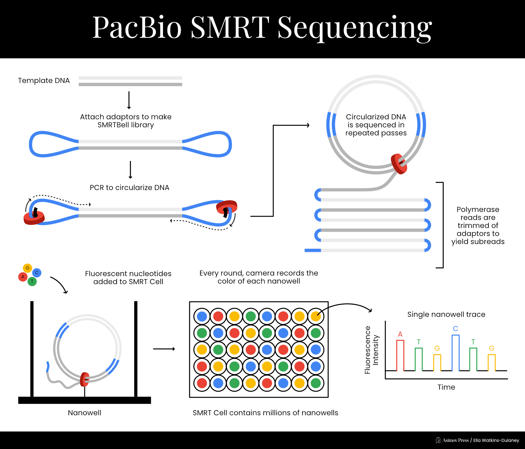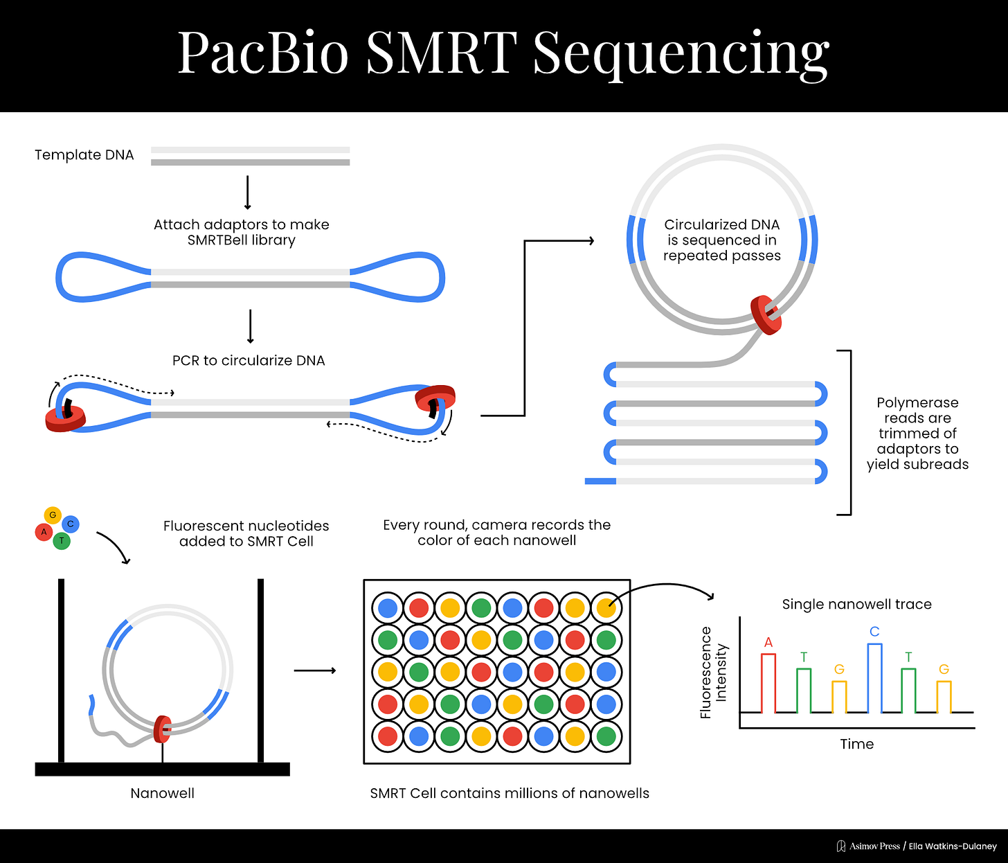 The next year, PacBio developed a new method to allow multiple sequencing passes on the same DNA molecule. Double stranded DNA templates were ligated to two single stranded adapters, creating what the company called a “SMRTbell template.” Sequencing began at a primer on one of the adaptors and could proceed multiple times per molecule due to circularization, in a process called rolling-circle amplification. This helped reduce PacBio’s error rates significantly.