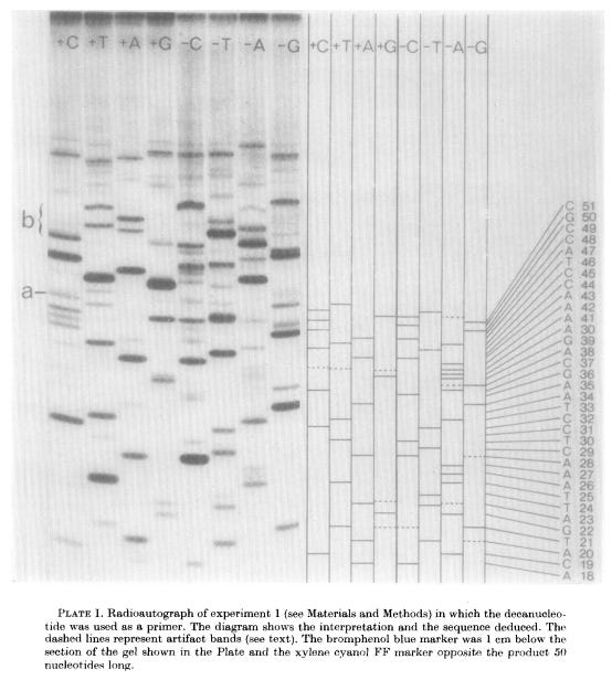 Although many scientists today assume that Sanger was the first to figure out how to sequence DNA, that’s not the case. As with RNA, Sanger was edged out by a Cornell biochemist. This time it was Ray Wu, who, in 1970, published a method to “read” specific sections of two bacterial virus genomes, called λ and bacteriophage 186. Wu’s method was only capable of sequencing “cohesive ends,” short single-stranded sections of these particular phage genomes, and so wasn’t considered a “general” solution to the DNA sequencing problem. In 1974, Wu’s lab refined this technique into the first general sequencing method, but it proved extremely labor-intensive and failed to catch on.