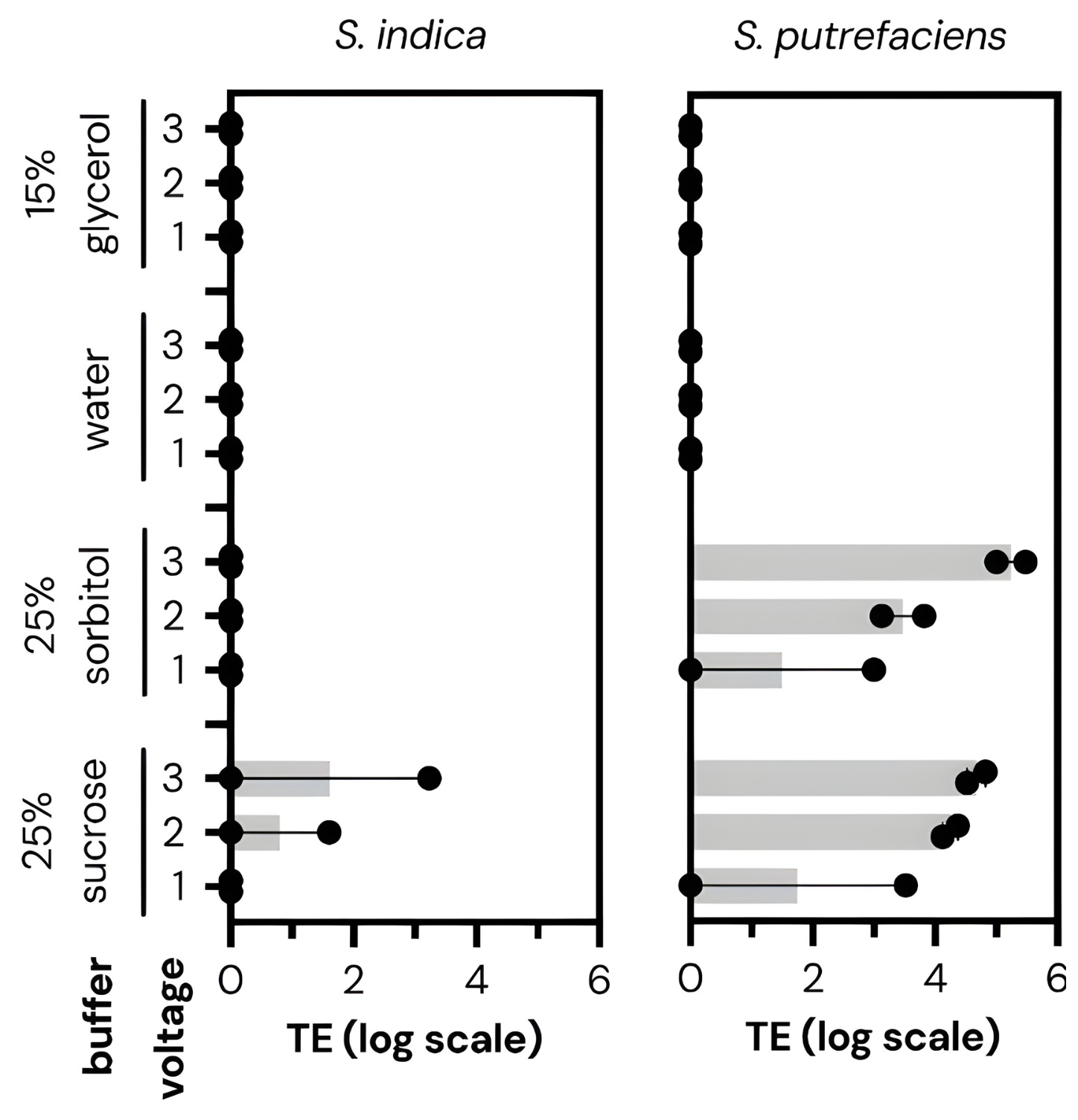 Some of the “optimal” parameters were quite surprising. For example, the wash buffer, or liquid used to prepare cells for transformation, had a huge effect on how well the electroporation actually worked. For each of the microbes, one buffer outperformed the others by at least 100-fold. Voltage was also important; while one kilovolt was usually enough to transform cells, increasing this to two or three kilovolts could, in some cases, lead to 1,000-fold improvements. (Higher voltages can also kill the cells, though, so one must tread carefully.)