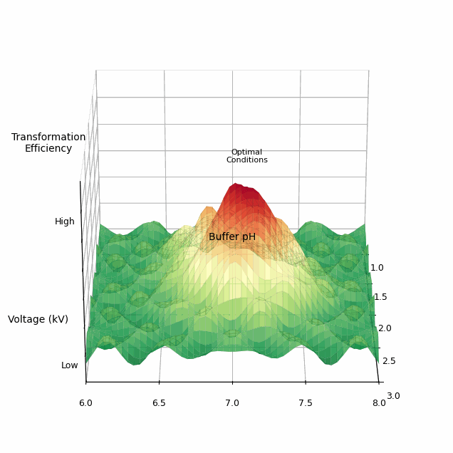 The total space of parameters for a single electroporation experiment is vast. One commercially available electroporator machine, called the BTX Gemini X2, has more than 4.2 million possible settings for voltage, resistance, and capacitance. And this doesn’t even include biological variables, like the buffer in which cells are washed, pH levels, or temperature.