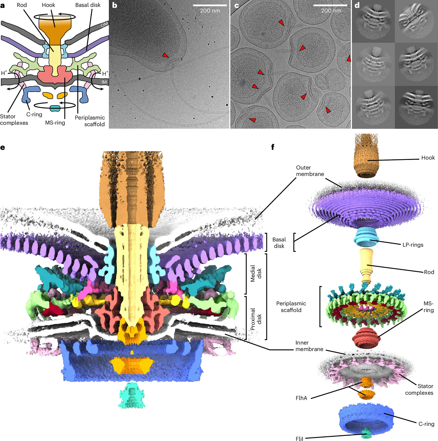 They did so by deleting a gene called flhG, which controls where the cell division machinery assembles, and other genes encoding flagellins, the proteins used to build the flagellum’s long tail. The result was a population of uniform, 200-nanometre-wide minicells, each carrying an intact, tailless flagellar motor near the surface. These minicells were thin enough for electrons to penetrate, thus allowing the researchers to image the motor at subnanometer resolution.3