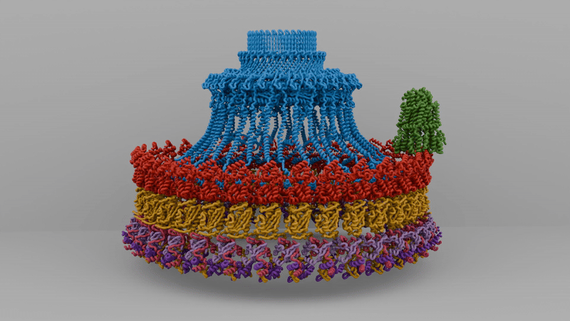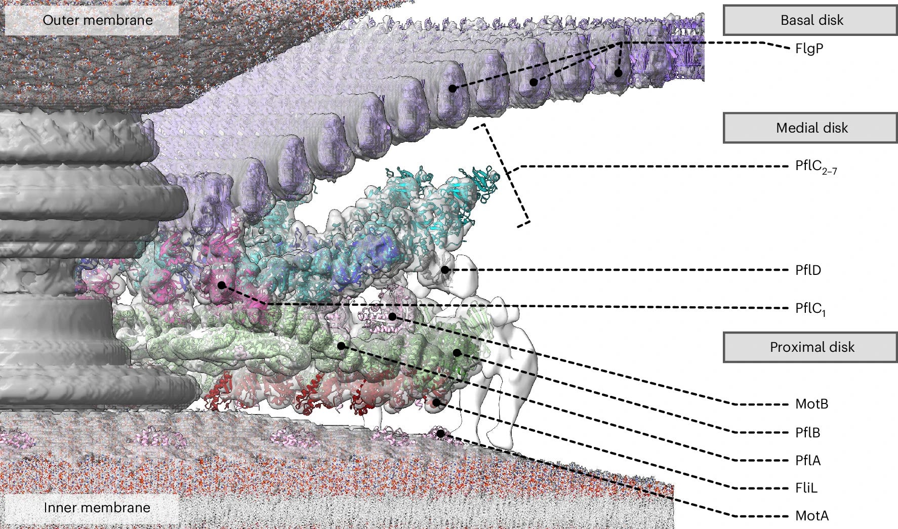 In 2021, Oxford researchers used cryo-electron microscopy to resolve the molecular details of the basal body from a microbe called Salmonella Typhimurium. The first part of the basal body, the C-ring, is located inside the cytoplasm just beneath the inner membrane and is built from three proteins — FliG, FliM, and FliN — repeated 34 times around the base. This structure converts torque from the stators into mechanical rotation on the rod.
