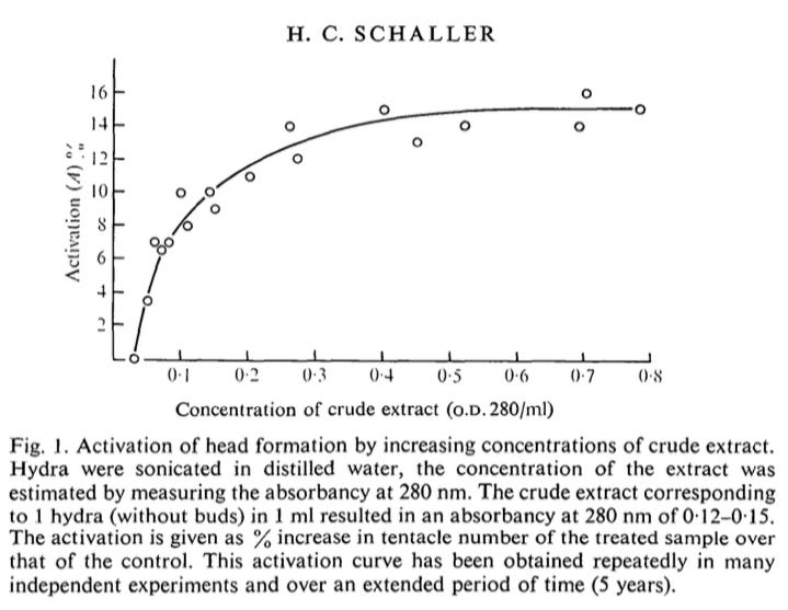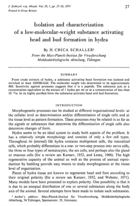 In 1973, a German graduate student named H. “Chica” Schaller published a paper under the prolix title: “Isolation and characterization of a low-molecular-weight substance activating head and bud formation in hydra.” The work was conducted in the Alfred Gierer lab at the Max-Planck-Institute for Virus Research in Tübingen, Germany. The lab had been working to understand morphogenesis (the process by which an organism develops) in Hydra attenuata. In the course of this work, they uncovered a substance that they claimed was responsible for initiating head formation in hydra.