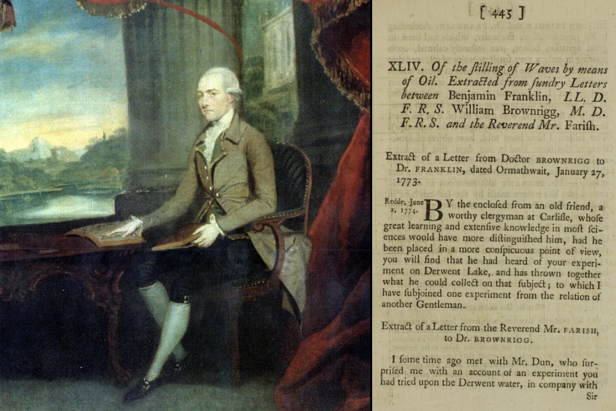 Brownrigg relayed Franklin’s letter to Mr. Farish, a clergyman in Carlisle whose full identity has been lost to history. Upon hearing Franklin’s results, Farish was incredulous. After all, how could such a small amount of olive oil cover half an acre of a pond’s surface? Farish requested a full account of the experiment, which Franklin wrote up and later published in the Royal Society’s journal, Philosophical Transactions, in late 1774. (Franklin’s original paper can still be read on the Royal Society’s website.)