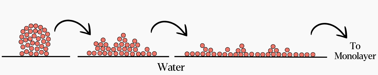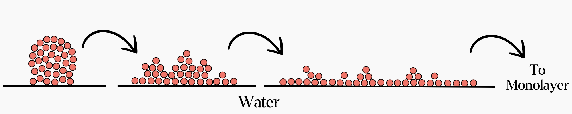 There are a few explanations. The first is that in 1890, many scientists assumed that molecules were a bit like little jostling balls. If an oil droplet consists of many such balls, then it makes intuitive sense that these balls would “roll over” each other until each of them makes contact with the water’s surface.