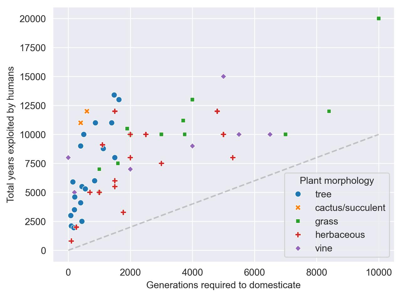 We can do a lot with this data. For example, if we split up domesticated crops by their gross morphology,12 it appears that trees (and possibly cactuses and succulents) may take fewer generations to domesticate than grasses, vines, and other herbaceous crops.13