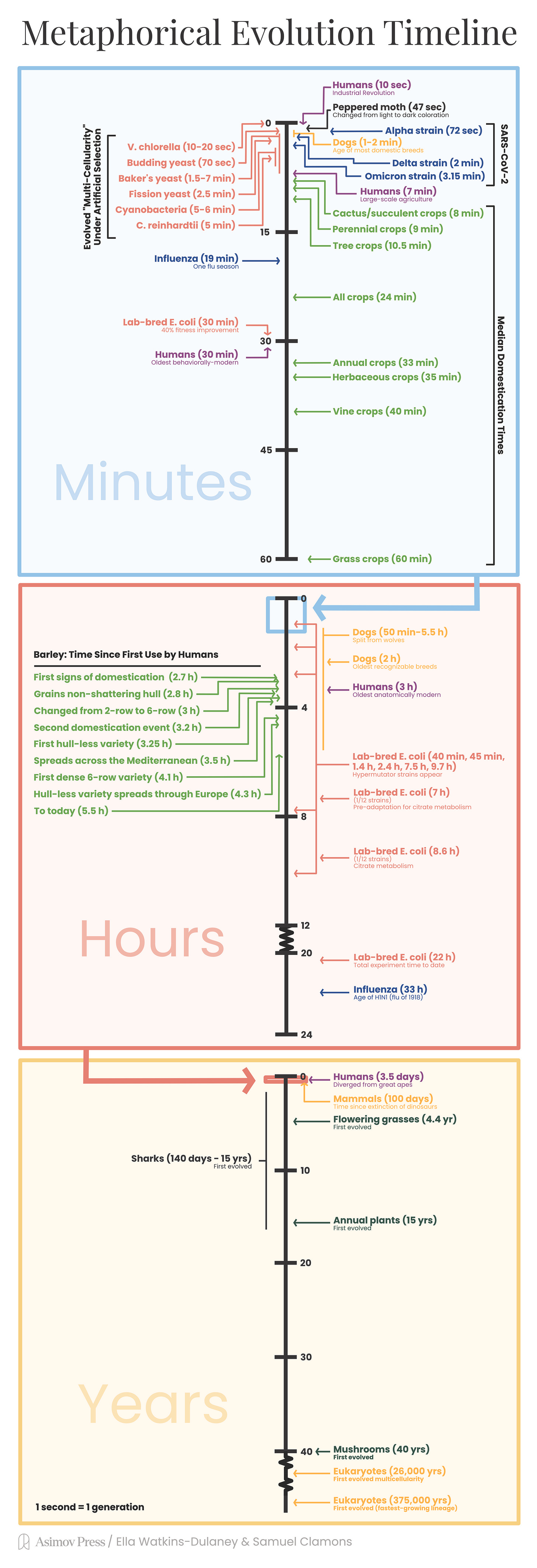 More importantly, using a single scale of “one second per generation” lets us place concrete evolutionary examples onto a more intuitive reference frame. The next time you learn that a weird animal lived so many millions of years ago, or a bacteria evolved antibiotic resistance in so many days, you can place it on that same common scale — simply divide the total time by the length of one generation, convert that number of seconds into something convenient like minutes or days, and you’ll be able to compare it directly to any of the examples given in this brief introduction.