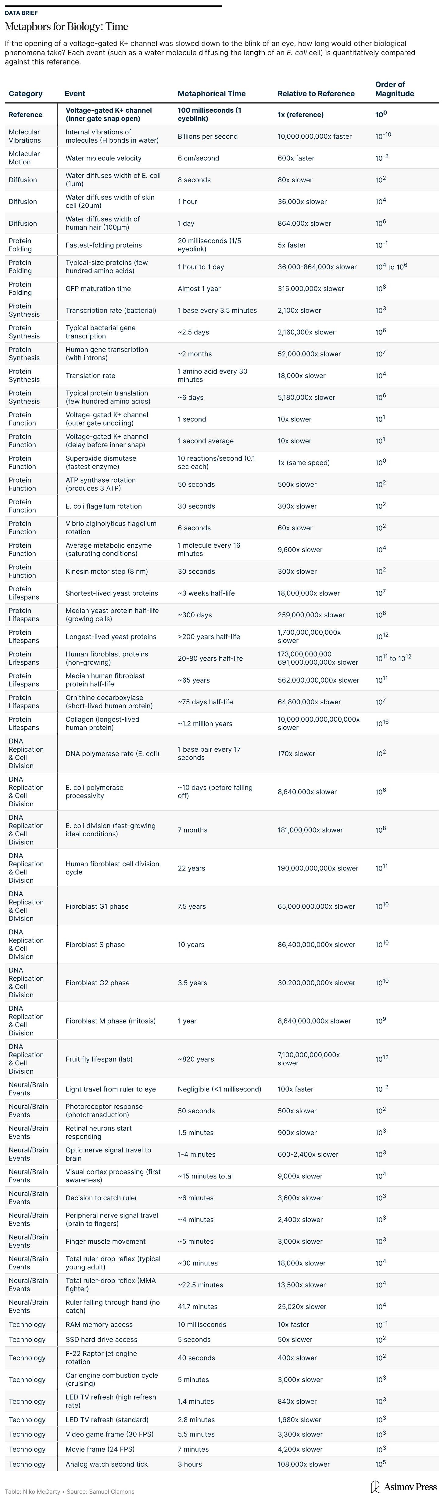 As with other hard-to-intuit quantities in science, one could look up biological rates using resources like PubMed or BioNumbers, to discover facts like “water flows through aquaporin at 100 million molecules per second,” or “yeast transcribes RNA at 0.12 molecules per minute.” But knowing a number doesn’t necessarily give one a feel for it. Are those rates… fast? How do they compare to protein folding? Or enzymatic activity? Or squeezing a muscle?