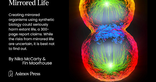 Excellent analysis of both the risks and potential benefits that may be best foregone. Though, I wonder if we could use synthetic and cell free methods to still synthesize mirror biomolecules. A mirrored ribosome doesn’t have to exist only in a mirrored cell. Could that allow us to access some of those mirrored peptide medicines and other potentially more robust mirror biomaterials, without the risk of uncontrolled spread?