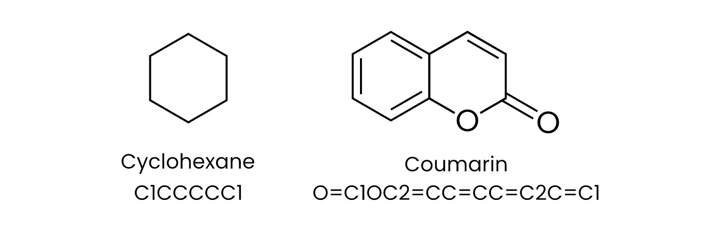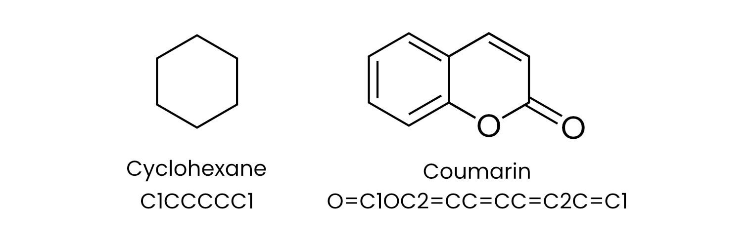 Then, in 1988, while at Pomona College in Claremont, California, chemist David Weininger devised SMILES (Simplified Molecular Input Line Entry System). SMILES provided a standardized, machine-readable line notation for encoding molecular structures. Like any language, SMILES is a formal system for representing information; in the context of chemistry, it acts like a cipher or code to translate molecular structures into linear character strings. A given molecule, according to convention, is spelled out as a word or a particular grammatical grouping of letters, where each letter corresponds to an individual atom. Contained in each word is also the logic for how certain letters connect or are arranged geometrically, including instructions for branching and ring closures. For instance, the six-carbon ring cyclohexane is represented by slicing open the ring and labeling the adjacent atoms with matching numbers to indicate connection and closure: C1CCCCC1. In the same fashion, coumarin can be written as O=C1OC2=CC=CC=C2C=C1.
