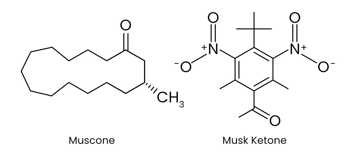 In the perfume business, musks are prized for their sensuality and longevity. They vary extraordinarily in chemical structure and source. Traditional musks include Moschus moschiferus from the abdominal gland of the male musk deer, civet from the perineal glands of the African civet cat, castoreum from the castor sacs of beavers, and ambergris from sperm whales. But natural musks are also costly, difficult to source, and fraught with ecological and ethical concerns, spurring the search for synthetic alternatives. In 1888, Albert Baur discovered the first synthetic “nitro-musk” while working with TNT, soon developing compounds such as musk ketone, musk xylene, and musk ambrette, today used in perfumes including Chanel No. 5. These nitro-musks were later banned due to toxicity and instability, replaced by safer, synthetic musks.