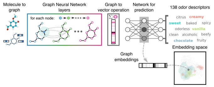 By 2019, researchers at Google Brain (now DeepMind) sought to overcome these constraints by expanding both the scale of training data and the fidelity of their model. Using deep learning and Graph Neural Networks (GNNs), a class of models that interpret molecules as graphs with atoms and bonds represented as nodes and edges, respectively, the study employed a dataset containing more than 5,000 odorants annotated by expert perfumers across over 100 descriptors, from mint and potato to sulfurous and grassy.