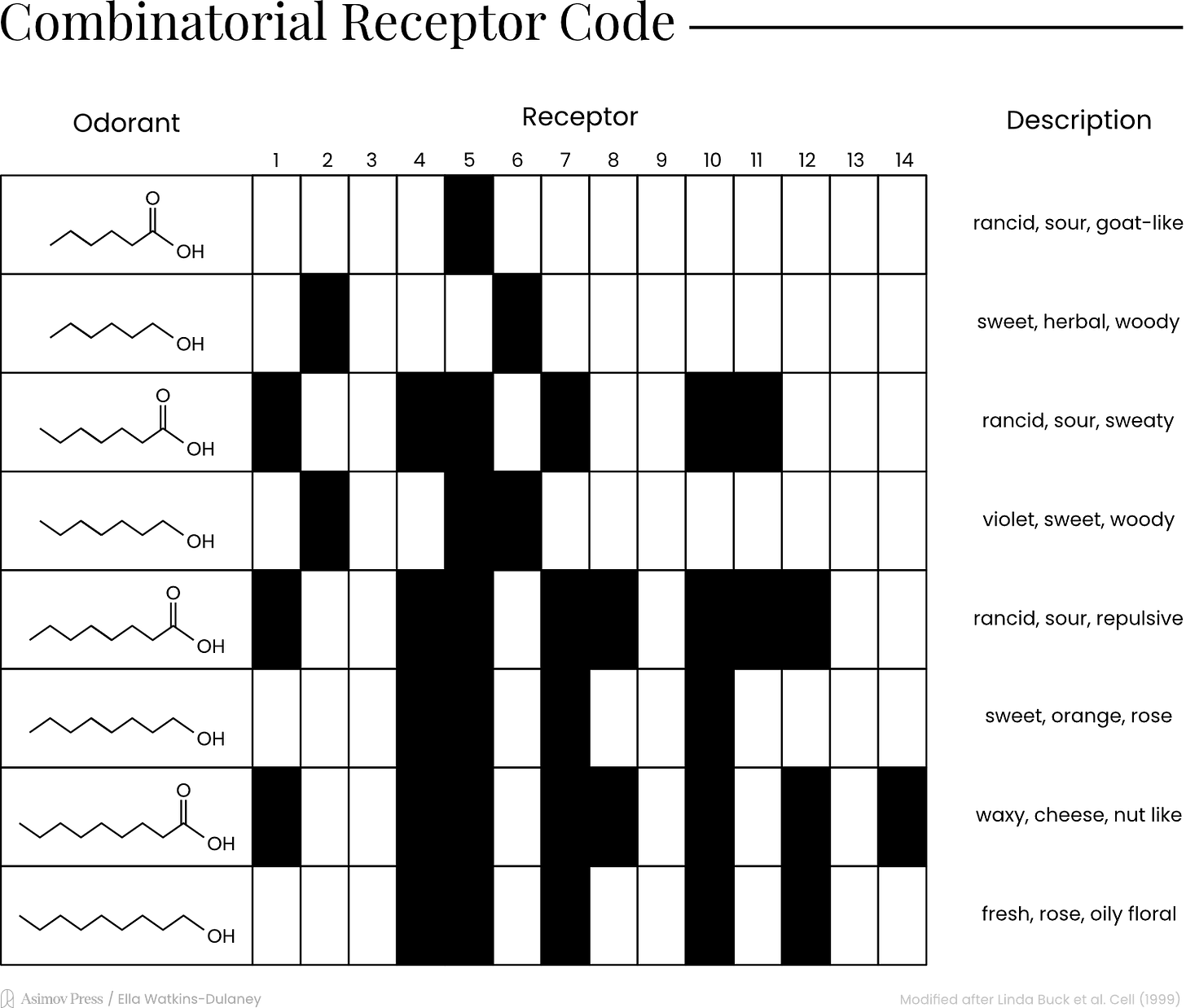 Crucially, no two scents ever strike the same pattern. The combinatorial activity of hundreds of receptor genes allows humans to detect and discern more than a trillion distinct odors.